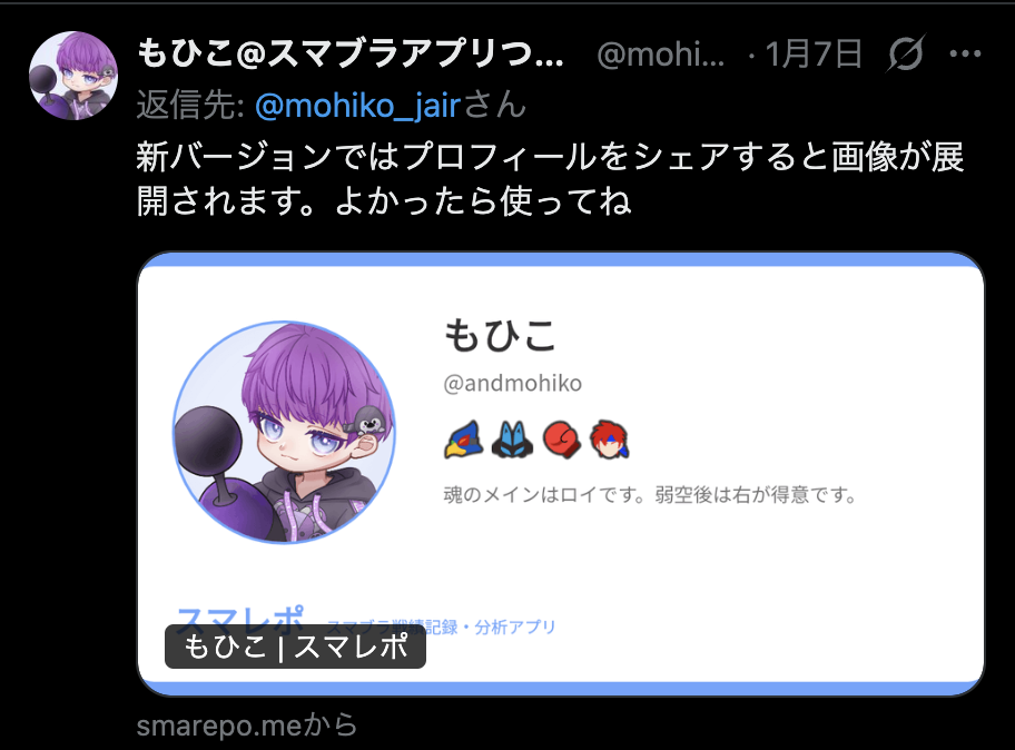 地味な新機能として、プロフィール画面をXでシェアするとOGP画像が表示されるようにしました。プロフィールが更新されるとCloud FunctionsでOGP画像が動的に生成されます。2025年の資産である動的なOGP画像の生成術を使い回しました。